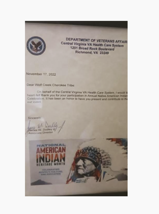 The Wolf Creek Cherokee Tribe honors military veterans by preserving their service legacy, recognizing their sacrifice, and educating the public about Native military tradition through cultural programs, public engagement, historical documentation, and community outreach across Virginia. Veteran service is recognized as an expression of responsibility, courage, and protection of future generations.